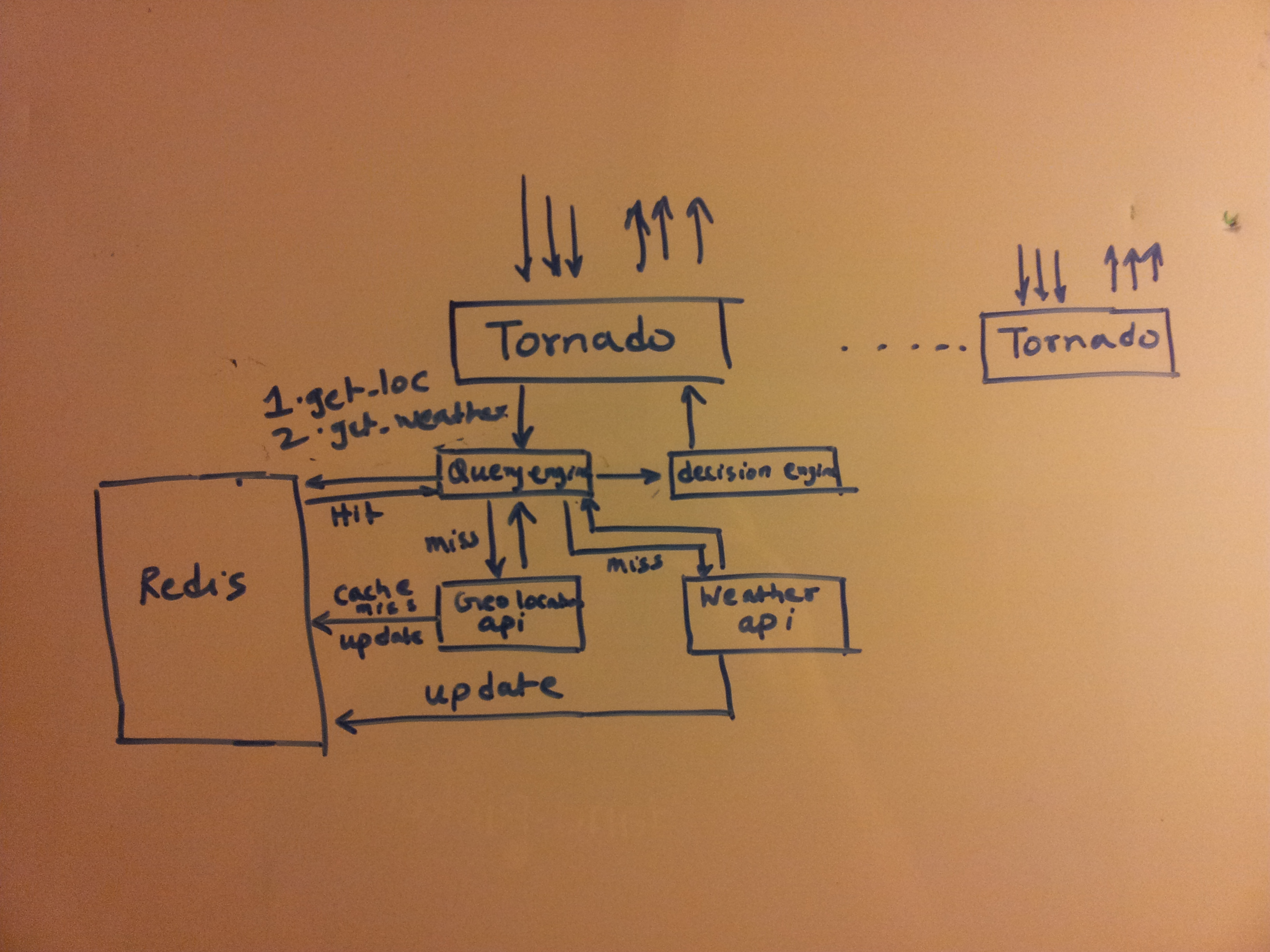 I decided to use tornado over apache mainly due to its low memory consumption during idle time and since I was going to write this in python. The decision to use Redis was a simple one as I would definitely need to cache some values as the end user requests came in.